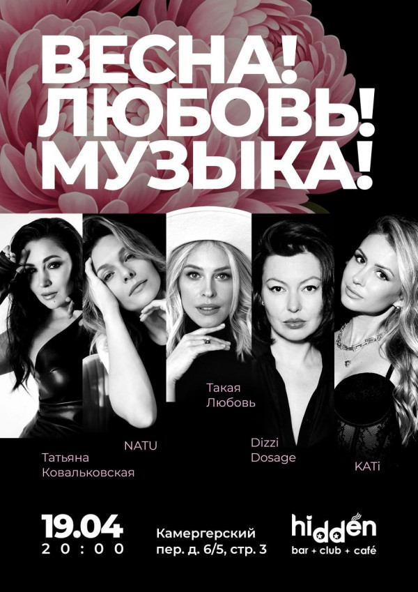 Не упусти возможность разделить эту любовь с Kati, NATU, Татьяна Ковальковская, Dizzy Dosage и конечно же Такая Любовь на сцене Hidden bar 19 апреля в 20.00!
